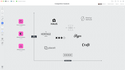 This competitor lanscape template is useful for mapping out industries or categories. It allows you to plot different organizations along two axis in order to form a big picture view of an industry.