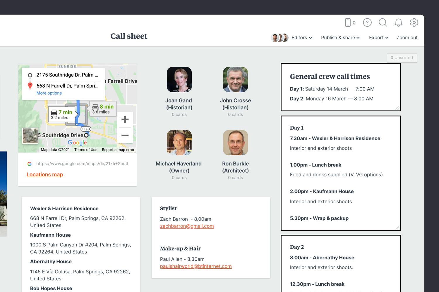 Once you have everything you need, it's time to organize your call sheet so it's easy to scan. Then share it with your team so everyone can start preparing for the shoot.