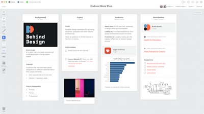 This template will help you answer these questions and create a solid foundation for your podcast. You'll map out your concept and episode format, define the audience, plan distribution, and more. Milanote lets you easily drag and drop images, videos, links, text, and notes, so it's easy to stay up to date.