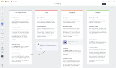 Milanote's drag-and-drop interface allows you to arrange columns, notes, lines, links, files, videos and tasks on an infinite virtual canvas. When you're finished your user story board, everything can be shared with your team for further collaboration and ideas.