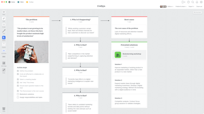 Get to the core of the problem with the 5 whys template. Originally developed by Japanese industrialist, inventor, and founder of Toyota, Sakichi Toyoda, the technique is an effective way to find underlying challenges and motivations.