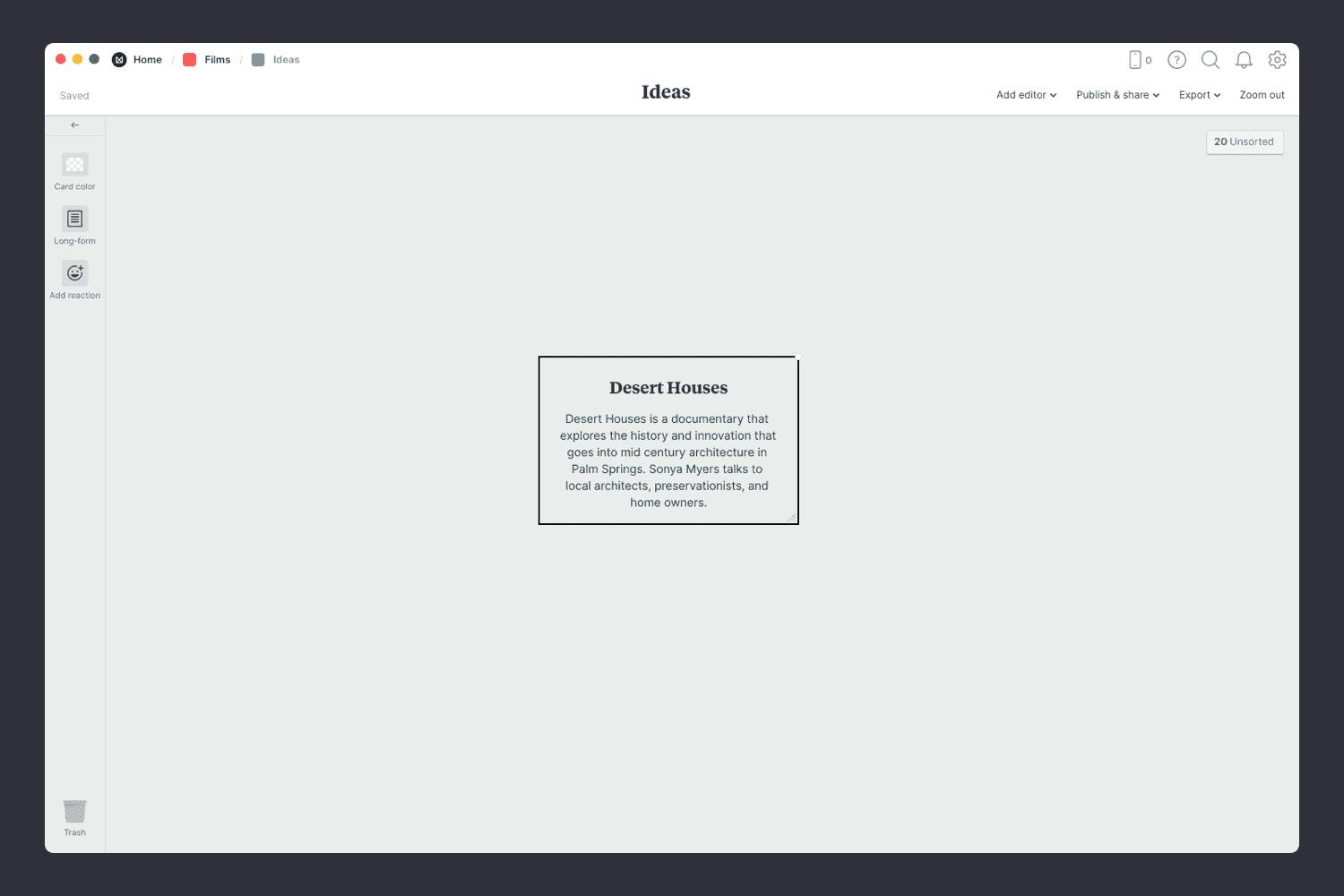 What's the idea or concept for your film? This is your starting point. It might be just a rough idea at the moment or a topic that you want to explore, but this process will help you see how far you can take it. Add a note that describes the film in 1 to 2 sentences to get started.