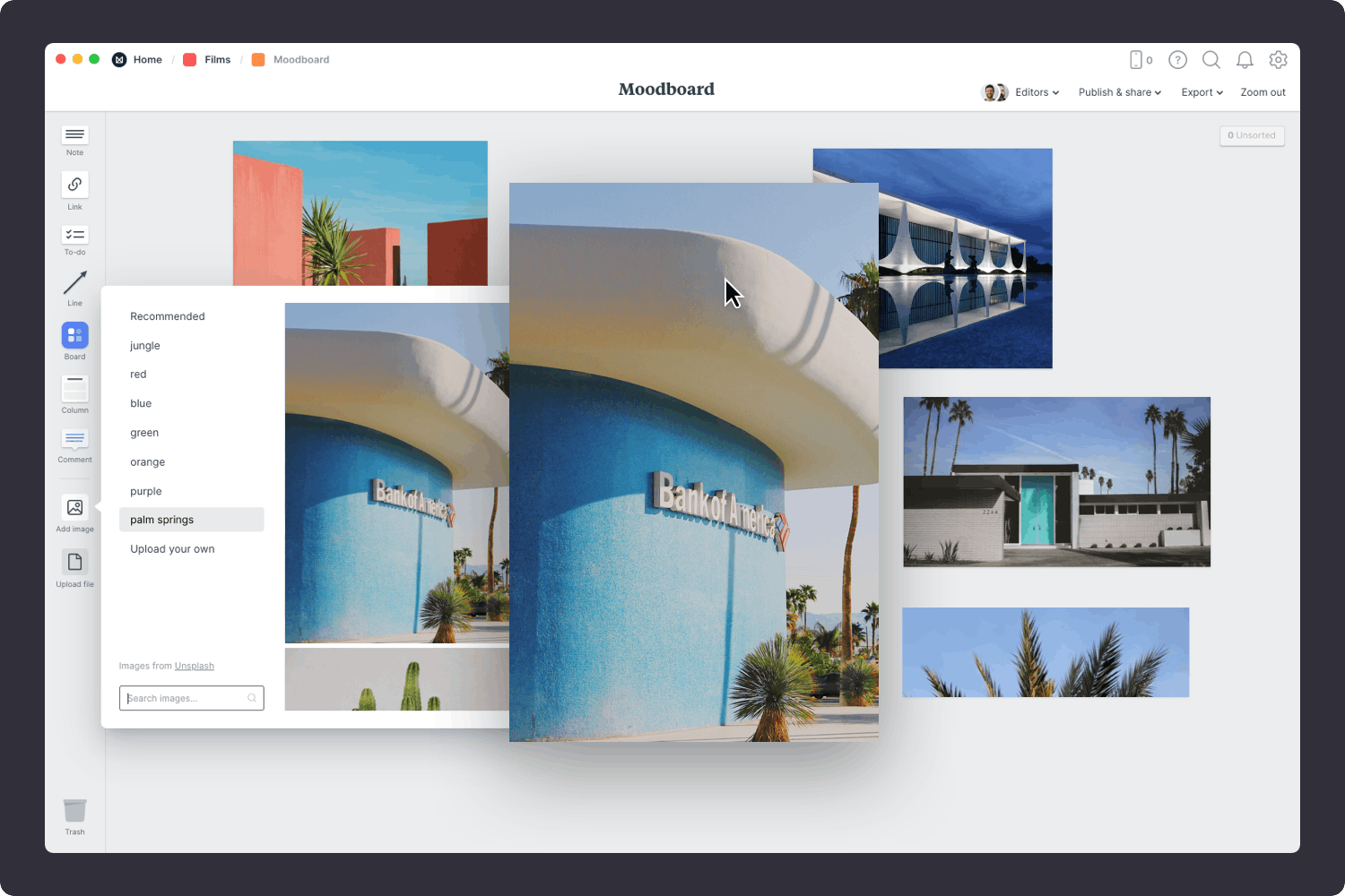 Start by adding any existing material you have—this could include stills from previous shoots, client references or images you've saved as inspiration. These might not make it into the final moodboard, but they're still a great place to start.