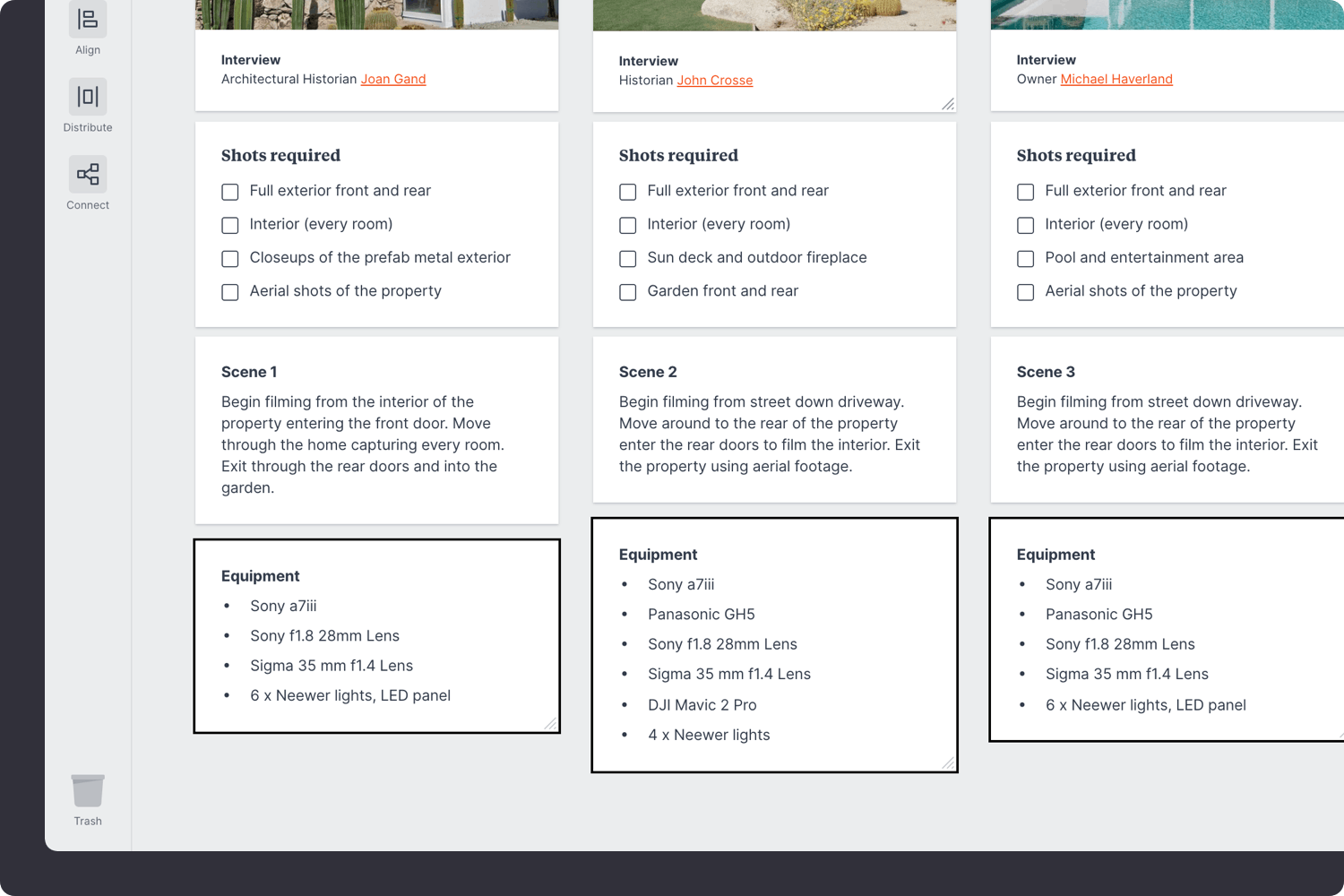 What equipment will you need to shoot these scenes? Imagine being half way through filming when you realize the spare battery pack is still in the studio. Adding a simple gear list will ensure you have everything you need on the day. It's a lifesaver!