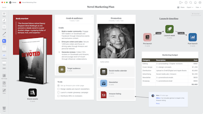 The novel marketing plan template helps you organize and manage every step of your book launch. From defining your audience and setting goals to planning promotions and tracking progress, everything comes together in a clear, easy-to-usefriendly workspace in Milanote. Whether you’re an indie author launching your first book or a seasoned writer collaborating with others, this template keeps you focused, organized, and connected with your readers for a successful launch.