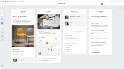 This call sheet template will help you to organize your team and ensure everyone arrives at the right time. Share this board with your team ahead of your shoot so everyone can come prepared.