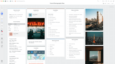 With Milanote’s visual drag-and-drop interface, it’s easy to organize your travel timeline, keep track of essential locations, and curate inspiration for your shoots. Whether you're preparing for a solo photo mission or a full content trip, this template gives you a clear overview of your creative and logistical plans.