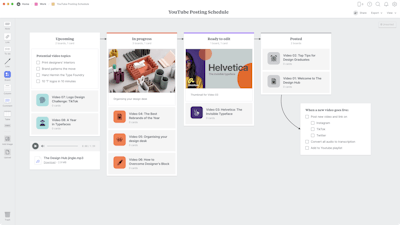 In Milanote, your posting schedule is more than just a timeline. You can add thumbnails, draft scripts, stay on top of tasks and set reminders to keep your production on track. Once your schedule is set, share it with your team or collaborators to ensure everyone is aligned.